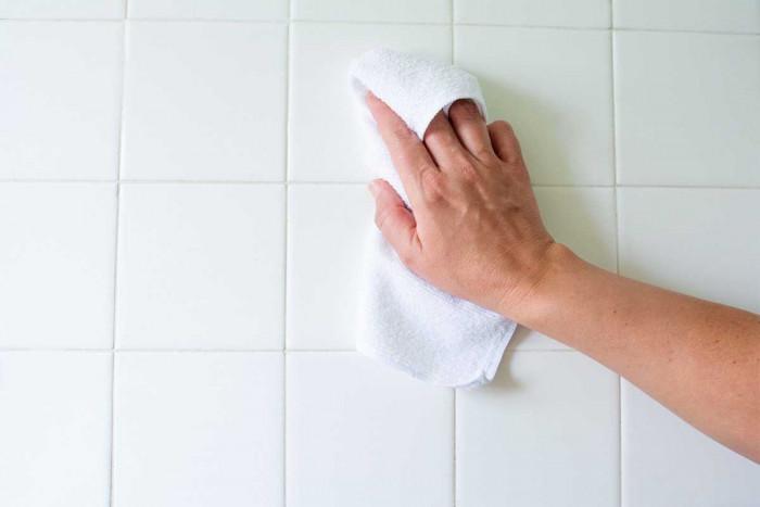 За по-дълбоко почистване напръскайте разтвор от оцет и вода и го оставете да престои няколко минути преди търкане – това помага за разграждането на мухъл и остатъци от сапун. Важно: оцетът трябва да се избягва върху плочки от естествен камък, тъй като може да направи повърхността им матова.