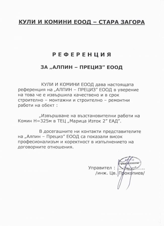 “"Алпин Прециз" ЕООД изпълни в срок и качествено поетите строителни дейности, с което доказа, че е коректен и надежден партньор.”