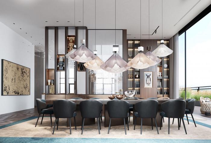 Трапезарията също е с внушителни размери. Освен това обаче не по-малко зрелищни са огромните осветителни тела. Те са акцентът в стаята и са пуснати сравнително на ниско ниво от масата.