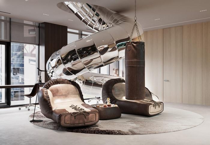 - В стаята за отдих дори фотьойлите са много нетипични. Те са от кожа, с дизайн на боксови ръкавици.