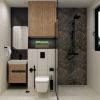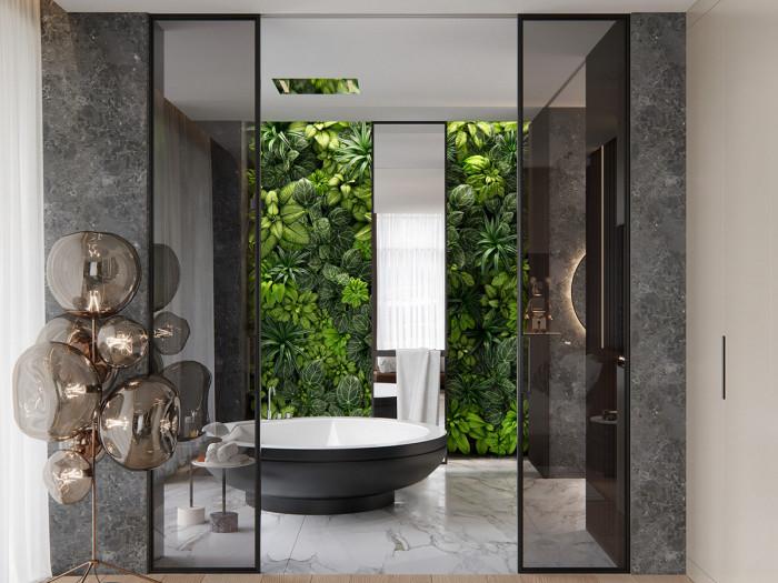 - Комбинацията от сиви нюанси, мрамор и стена със зеленина е повече от успешна.