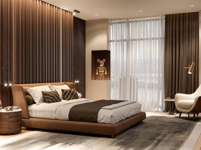 Идва ред и на спалнята. В стаята преобладават топли, меки, кафяви тонове, които създават една много интимна атмосфера. Осветлението е много деликатно и изцяло липсват всякакви натрапчиви предмети.