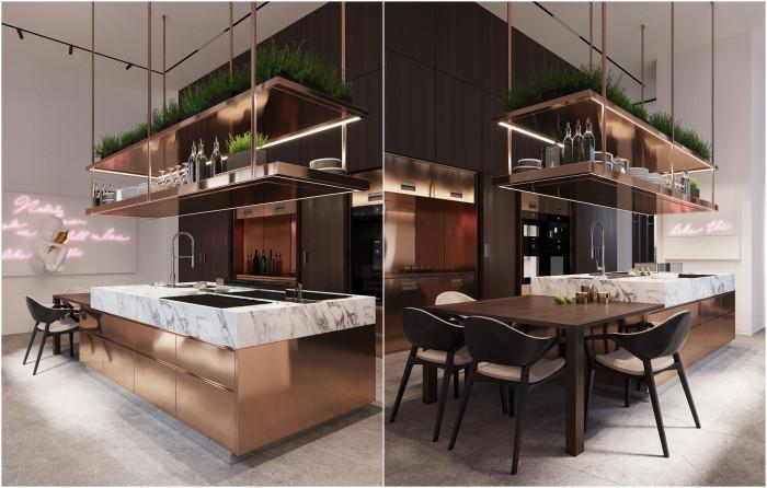 Кухнята е истинско лъскаво зрелище. Медни нюанси са съчетани с мраморен плот. Всичко тук крещи: „Лукс“.