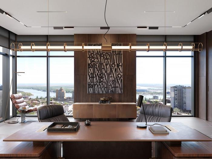 В мезонета има място и за голям хоум офис. Интериорът в него е в кафявата гама и всяка мебел е добре преценена с цялостната атмосфера. Но не това е важното в случая. Най-впечатляваща е гледката, която тази стая има. От огромните френски прозорци се разкрива панорама към целия град.