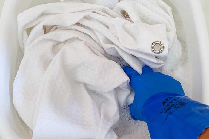 Ако вашето перде или подплата има признаци на натрупване на сапунена пяна или плесен, особено около дъното, използвайте ензимен спрей за петна като спрея за отстраняване на петна. След това накиснете зоната в кислороден избелител и изтъркайте с мека четка за почистване, преди да изперете. Това ще помогне за премахване на цялата тази мръсотия и ще стане отново като нов.