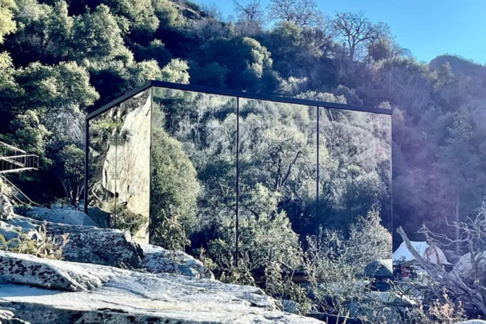 Този необичаен дом се намира на територията на Paradise Ranch Inn, модерен екологичен обект, разположен на над 20 акра земя в Калифорния. Той представлява куб, облицован изцяло с огледални панели, който сякаш израства изпод планината и напълно се разтваря в околния пейзаж. Вътрешността му е обзаведена в лаконичен скандинавски стил и в него могат да се настанят двама души.