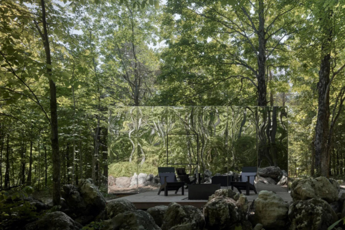 Тази къща не е единствената в "огледалния" къмпинг в гората на Торонто, там има цяло "семейство" от тях и всички те се отдават под наем. Къщата с фасада от неръждаема стомана разполага с всичко необходимо за комфортна почивка сред природата: спалня, кухня, баня, тераса с барбекю зона. Огледалната облицовка, която поради формата си изкривява околния пейзаж, я превръща в истински мираж.