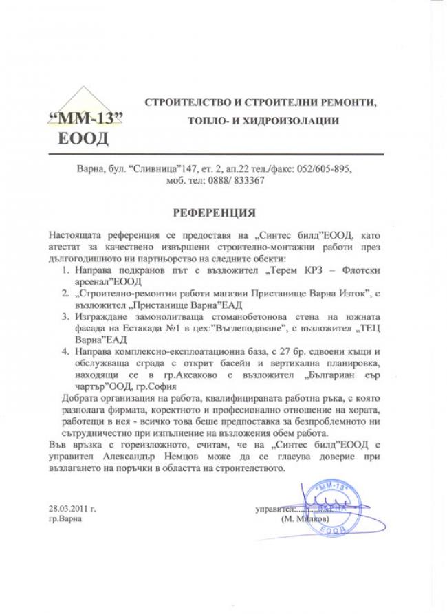 - Реконструкции и ремонти : Реконструкция, пристройка и надстройка на двуетажна къща - гр.Варна, ул.”Вярност” № 21; Реконструкция и ремонтно-довършителни работи на Кафе-бар в гр. Варна; Основен ремонтна складови помещения; Основен ремонт офиси на фирма “Либор” ООД; Основни и ремонтно-довършителни работи на апартаменти в гр. Варна и гр. Балчик; Ремонтни работи по сгради на фирма “Нестле България” АД - Варна; Довършителни работи на апартаменти и къщи; Довършителни работи в “Гранд МОЛ” - Варна с възложител “Бул-Бел” ЕООД;