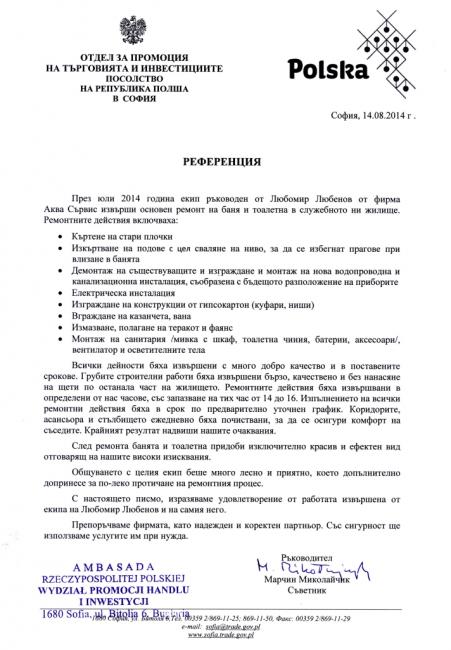 “След промяна на офертата от наша страна, Аква Сървис се заеха с подмяната на цялата В и К инсталация в апартамента. Положиха нови траби в банята, подмениха трабите в кухнята, демонтираха старите и монтираха новите радиатори за парно. Предложиха ми раличен вариант за подредбата на мебелите в банята, който се оказа в пъти по-удачен от предварително избрания от нас.