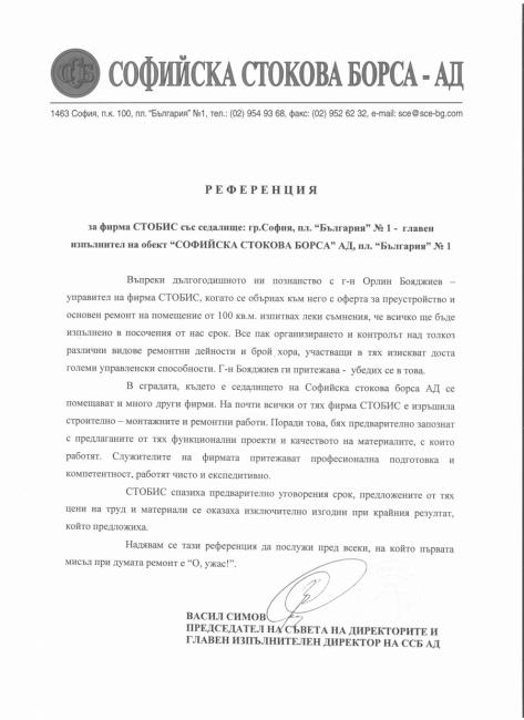 “Дружеството познавам от дълги години и съвместно сме изпълнили много обекти. Препоръчвам на други инвеститори "СТОБИС 2000" ООД, като надежден партньор, разполагащ с необходимата техника и технически капацитет.”