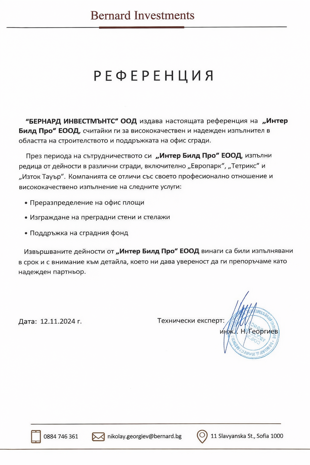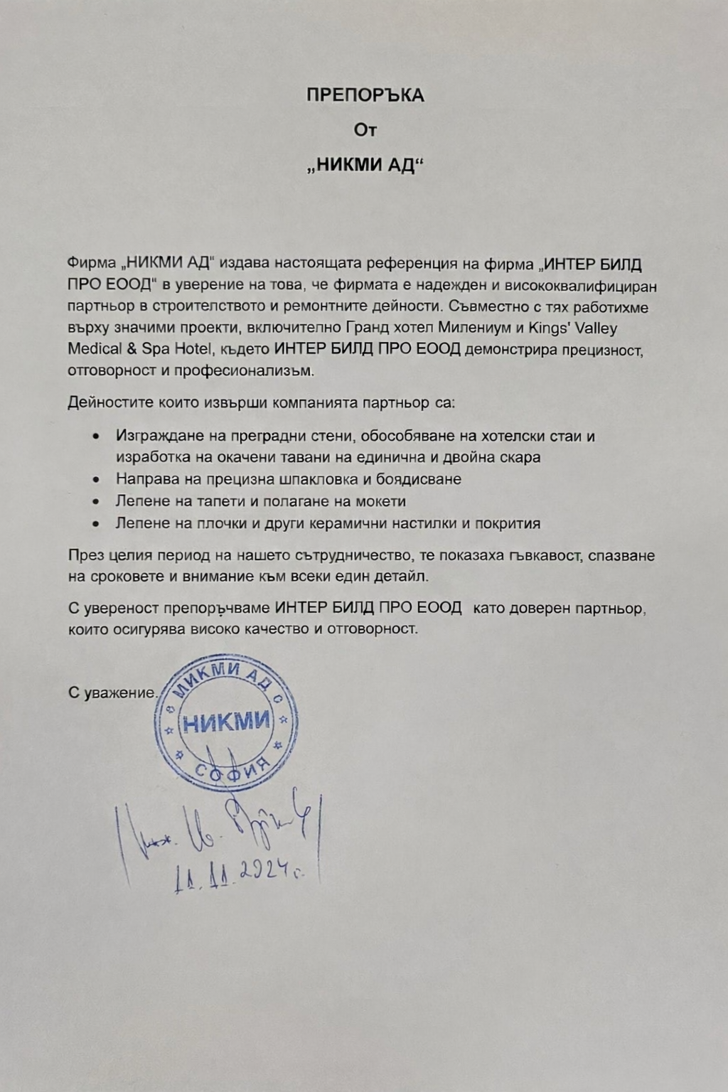 Компанията има над 20 години опит на пазара и успешно е реализирала множество проекти – жилищни довършителни работи, луксозни хотели, офиси, къщи, търговски и обществени обекти. Като утвърден и надежден партньор, ние продължаваме устойчиво да развиваме дейността си и да надграждаме качеството на услугите си