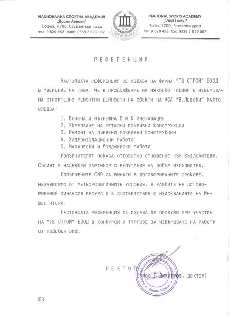“Всички строителни и ремонтни дейности бяха извършени качествено и в срок съгласно условията на договорите, сключени между нас. Фирмата работи с качествени материали и разполага със съвременна техника.”