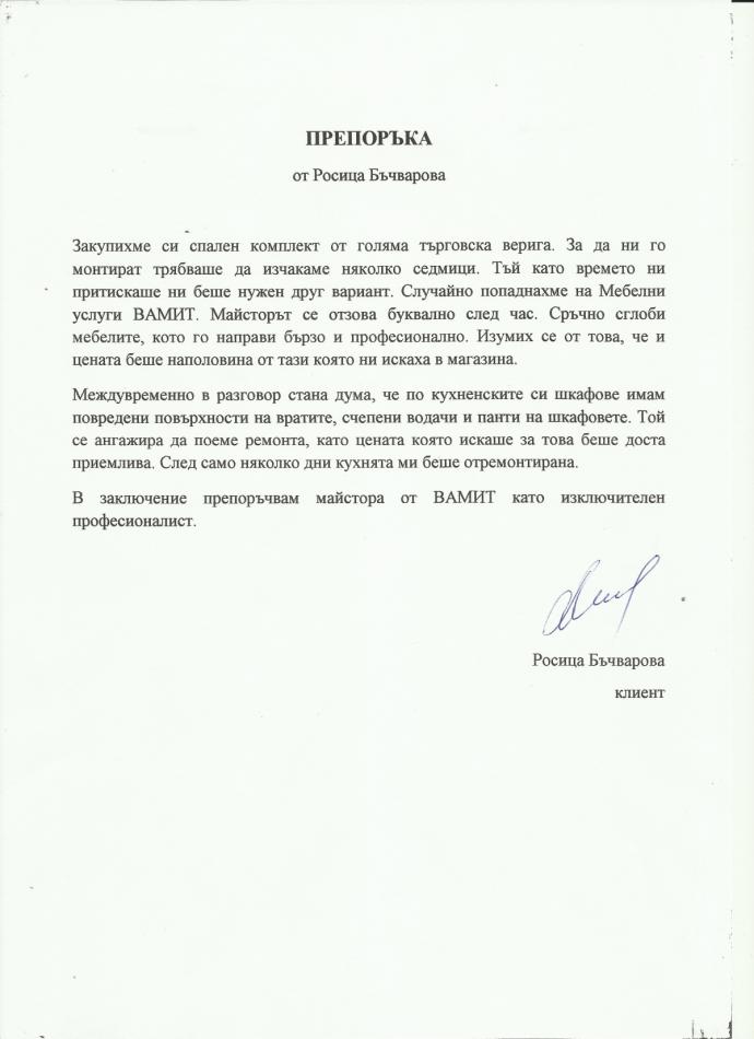 “Закупих си спален комплект от голяма търговска верига, за да ни го монтират трябваше да изчакаме няколко седмици. Тъй като времето ни притискаше ни беше нужен друг вариант. Случайно попаднахме на мебелни услуги Вамит. Майсторът се отзова буквално след час. Сръчно сглоби мебелите, като го направи бързо и професионално.”