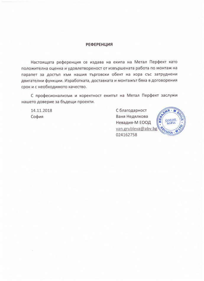 “Настоящата референция се издава на екипа на Метал Перфект като положителна оценка и удоволетвореност от извършената работа по монтаж на парапет за достъп на нашия търговски обект на хора със затруднени двигателни функции.”