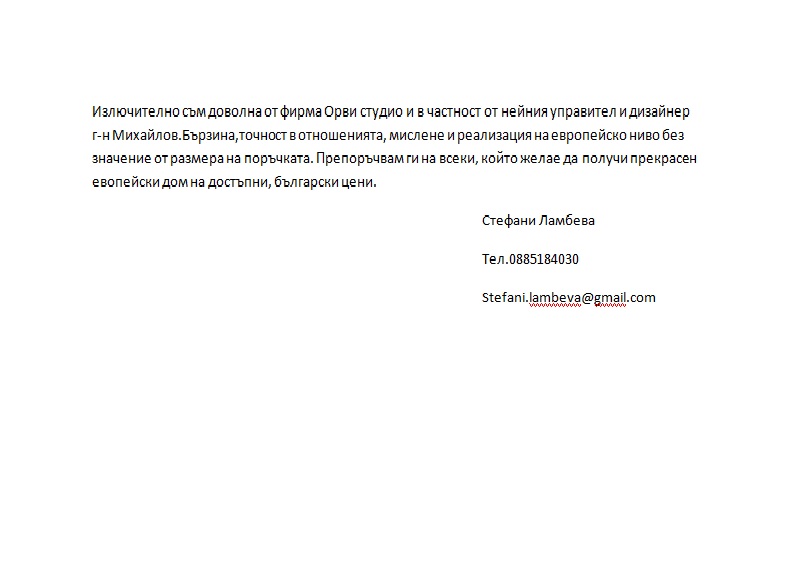 “Много съм доволна от работат на "Орви студио". По моя заявка изготвиха прецизен проект за ъглова кухня, мебели за спалня и входно антре. Изработката беше перфектна, а монтажът беше извършен много чисто. Г-н Михайлов ми съдейства и за закупуването на кухненските електроуреди, които бяха монтирани и свързани от неговите служители. Ще използвам услугите на "Орви студио" и в следващия си проект. Препоръчам ги на всички, които очакват срочна и прецизна изработка на мебели.”