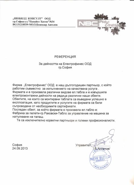 “Фирма "Електрофинес" ООД е наш дългогодишен партньор, с който работим съвместно за изпълнението на качествена услуга. Фирмата и е произвела различни видове ел. табла и е извършила електромонтажни дейности на редица наши обекти.”