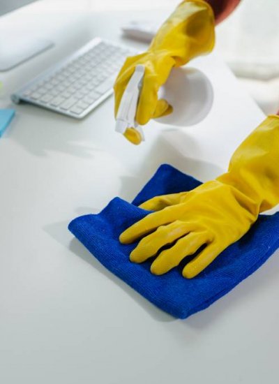 Помощниците извършват дезинфекция на често докосвани повърхности като клавиатури, дръжки на врати и копчета за асансьор, както и ключове за лампи.